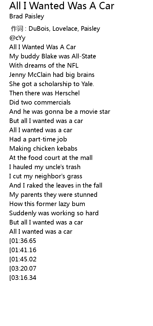 | [00:57.19] | But all I wanted was a car |