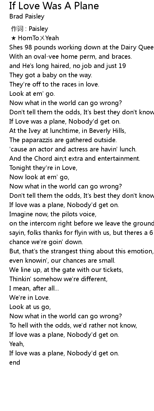 | [03:28.39] | If love was a plane, Nobody'd get on. |