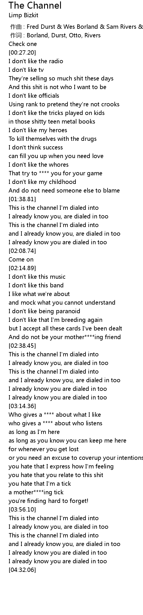 | [00:00.00] | 作曲 : Fred Durst & Wes Borland & Sam Rivers & John Otto |
