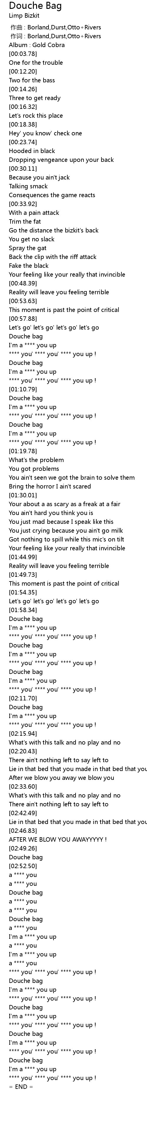 | [00:00.671] | 作词 : Borland,Durst,Otto+Rivers |