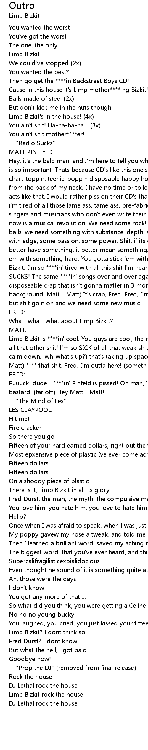 Limp Bizkit is ****in' cool. You guys are cool; the new record's great, but **** all that other shit! I'm so SICK of all that weak shit (Fred in backgound: Matt, calm down.. wh-what's up?) that's taking up space in the charts. (Fred: Woah, Matt) **** that shit, Fred, I'm outta here! (something breaks in background) |