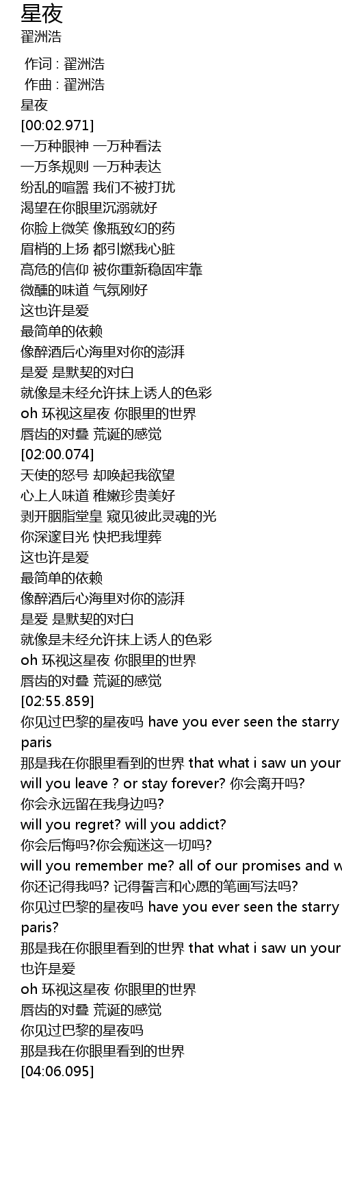 | [02:58.589] | ni jian guo ba li de xing ye ma have you ever seen the starry night in paris |