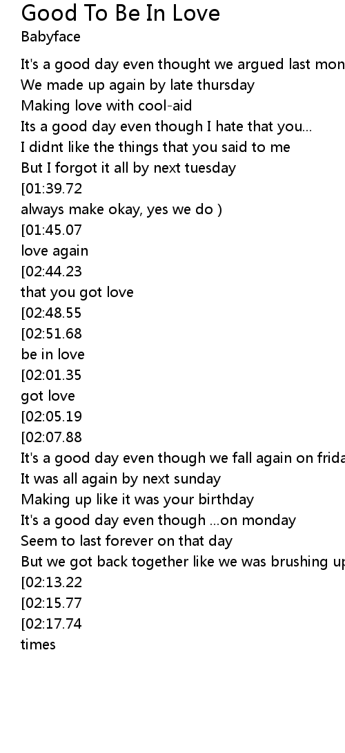 | [03:13.20][02:51.68][01:57.01][01:02.02] | Ain't it good you know that its good to be in love |