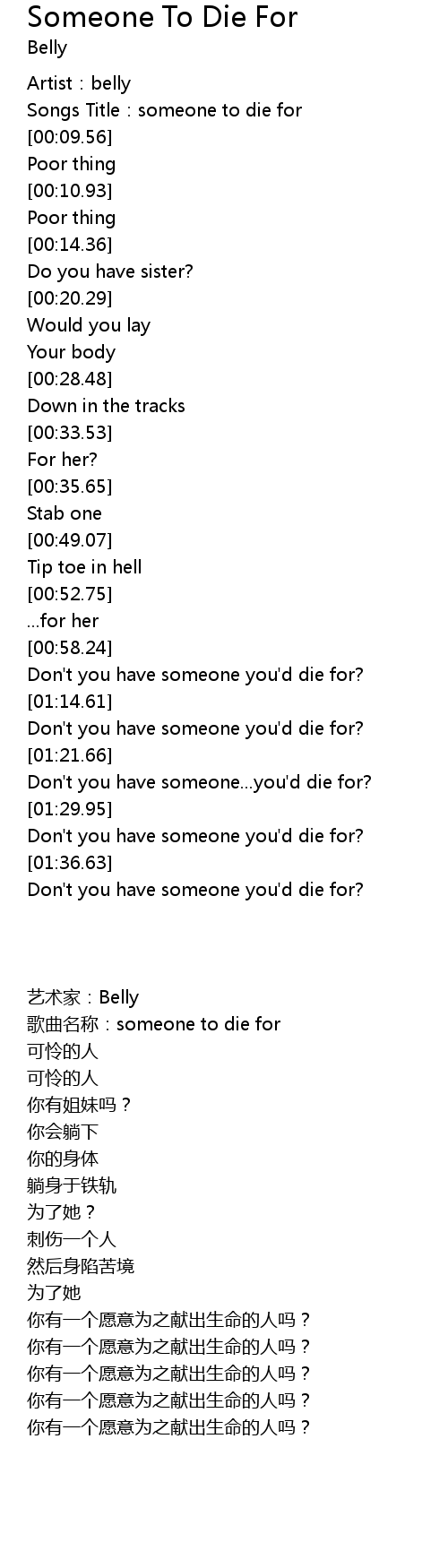 | [01:33.51] | Don' t you have someone you' d die for? |