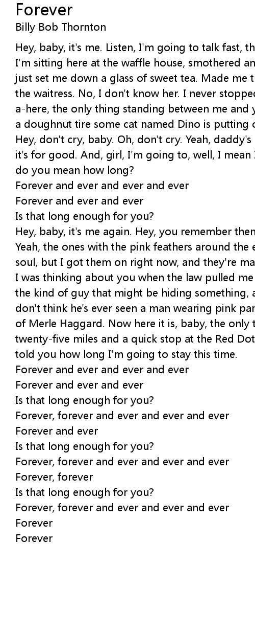 Hey, baby, it's me. Listen, I'm going to talk fast, this is long distance. Yeah, I'm sitting here at the waffle house, smothered and covered. Yeah, precious, just set me down a glass of sweet tea. Made me think about you. No, baby, she's the waitress. No, I don't know her. I never stopped in Texarkana before. Look a-here, the only thing standing between me and you now is two hundred miles and a doughnut tire some cat named Dino is putting on at the Sinclair next door. Hey, don't cry, baby. Oh, don't cry. Yeah, daddy's coming home and this time it's for good. And, girl, I'm going to, well, I mean I'm going to love you. What do you mean how long? |