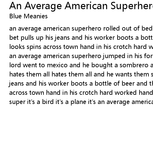 an average american superhero rolled out of bed read the sports page lost his bet pulls up his jeans and his worker boots a bottle of beer and those penthouse looks spins across town hand in his crotch hard worked hands dreams are blocked an average american superhero jumped in his ford turns on the stereo praise the lord went to mexico and he bought a sombrero always talks about those mexicans hates them all hates them all and he wants them superhero so super pulls up his jeans and his worker boots a bottle of beer and those penthouse looks spins across town hand in his crotch hard worked hands dreams are blocked superhero so super it's a bird it's a plane it's an average american superhero |