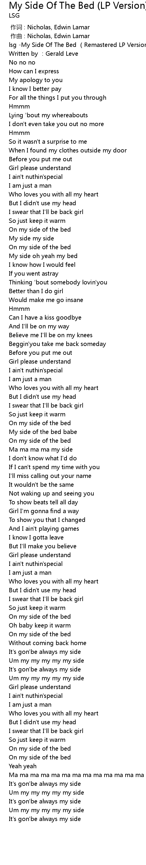 | [00:00.162] | lsg My Side Of The Bed Remastered LP Version |