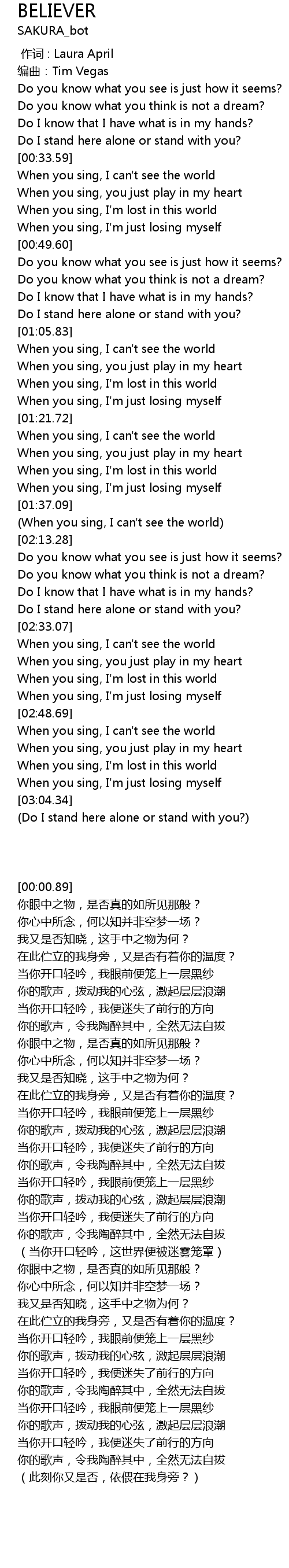 | [00:34.58] | When you sing, I can' t see the world |