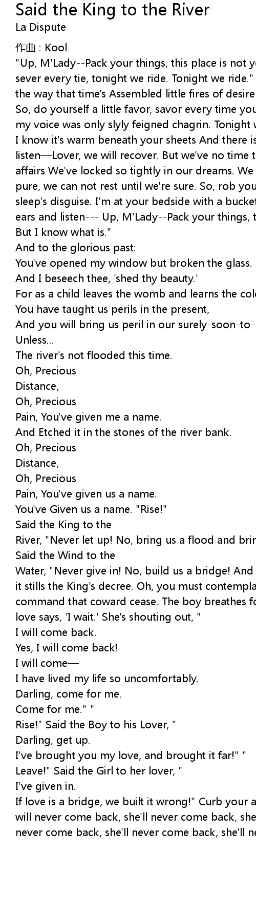 | If love is a bridge, we built it wrong!" Curb your anger. Still your fists. She will never come back, she' ll never come back, she' ll never come She will never come back, she' ll never come back, she' ll never come |
