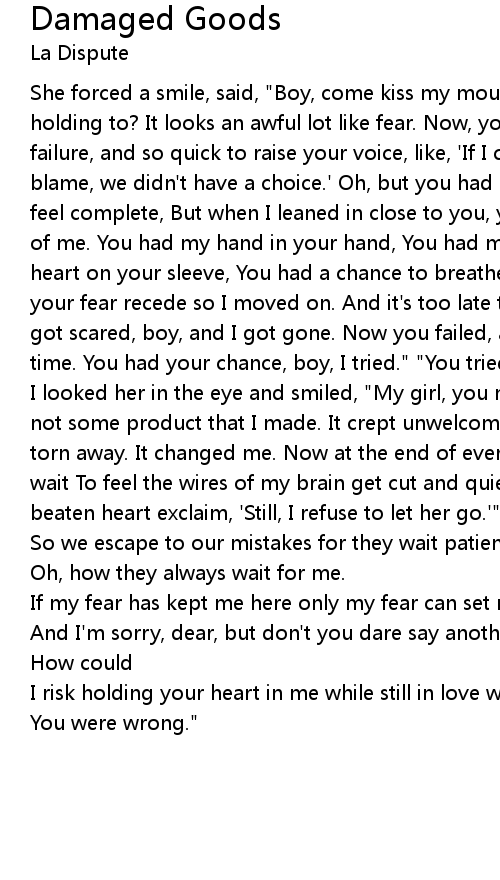 She forced a smile, said, "Boy, come kiss my mouth You know that hope you're holding to? It looks an awful lot like fear. Now, you're so quick to fall on failure, and so quick to raise your voice, like, 'If I can't find a mistake to blame, we didn't have a choice.' Oh, but you had option. I was your chance to feel complete, But when I leaned in close to you, you Kissed your fear instead of me. You had my hand in your hand, You had my lip in your teeth, You had my heart on your sleeve, You had a chance to breathe. But, boy, you wouldn't let your fear recede so I moved on. And it's too late to change your mind now, You got scared, boy, and I got gone. Now you failed, and there's no way to turn back time. You had your chance, boy, I tried." "You tried?" |