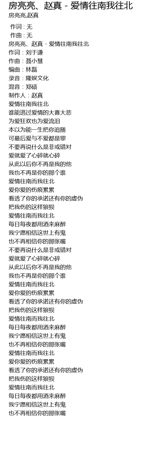 | [00:00.759] | 房亮亮、赵真 - 爱情往南我往北 |