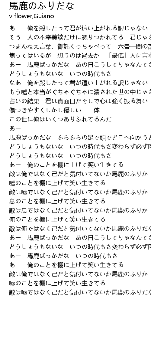 | [00:45.02] | あー 馬鹿ばっかだな あの日こうしてりゃなんてさ たらればだけを吐くマシンだ |