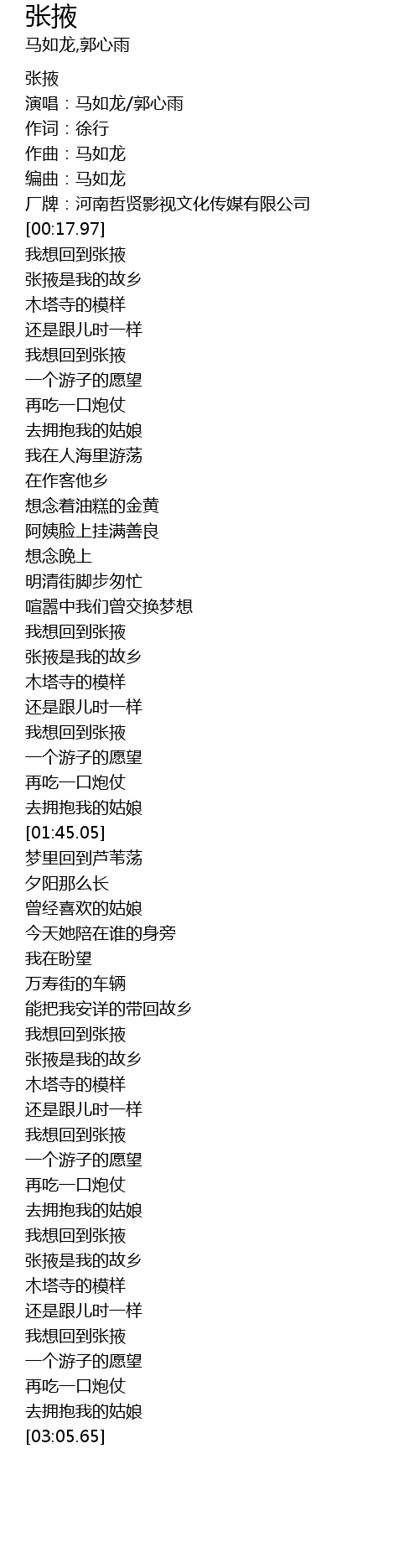 | [00:03.85] | 演唱:马如龙/郭心雨 |