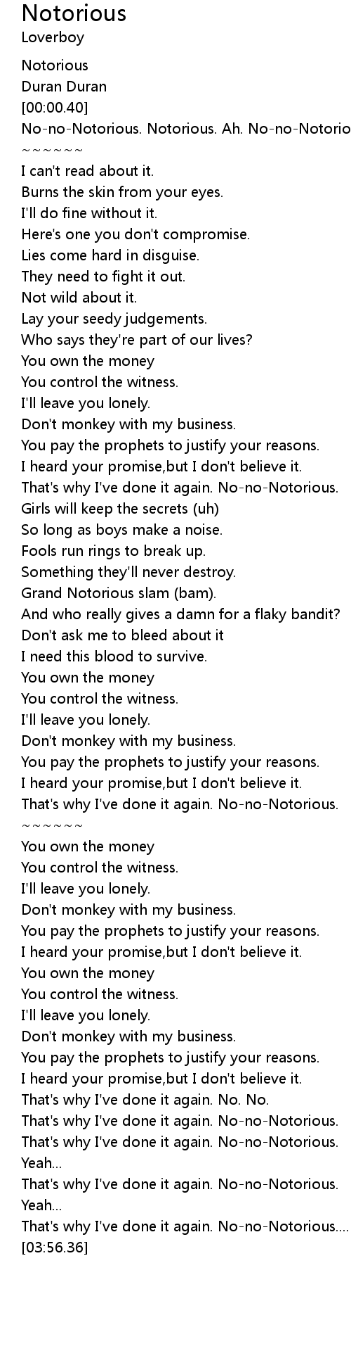 | [00:00.84] | No-no-Notorious. Notorious. Ah. No-no-Notorious. |