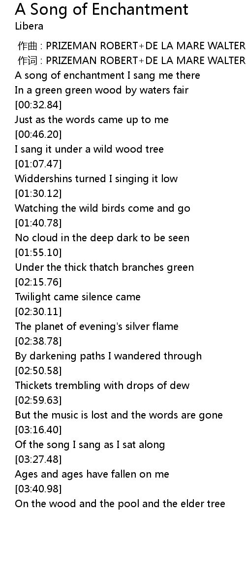| [00:01.00] | 作词 : PRIZEMAN ROBERT+DE LA MARE WALTER |