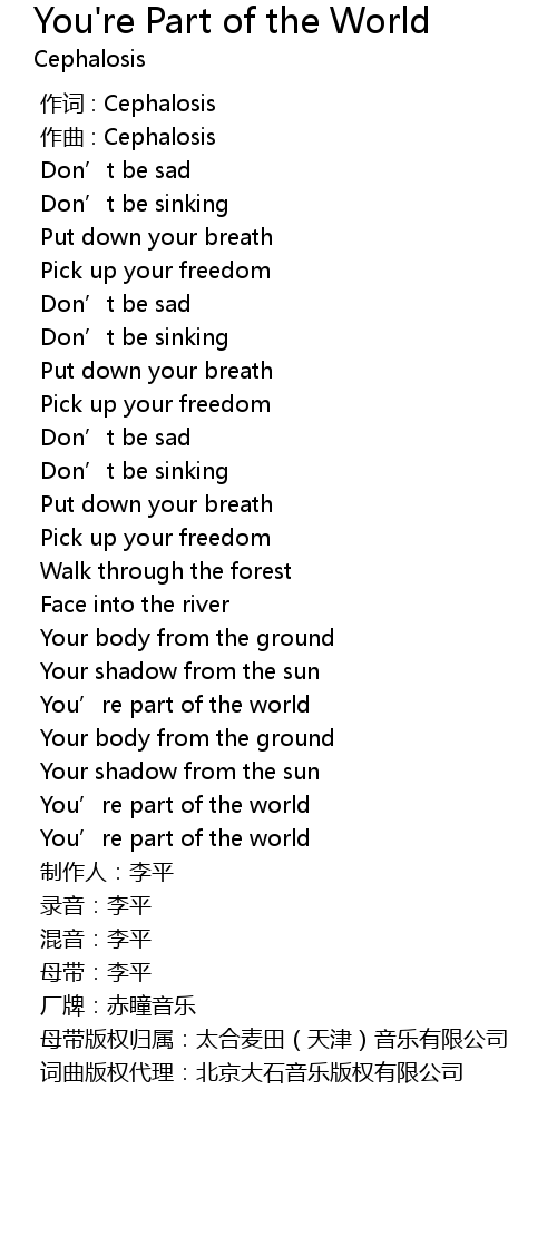 | [05:22.672] | 母带版权归属:太合麦田(天津)音乐有限公司 |
