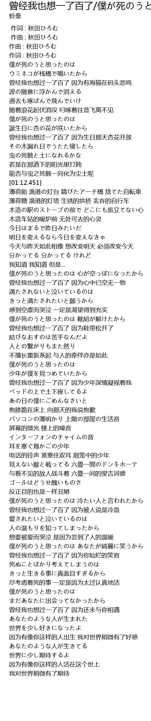 | [04:44.872] | 僕が死のうと思ったのは まだあなたに出会ってなかったから |