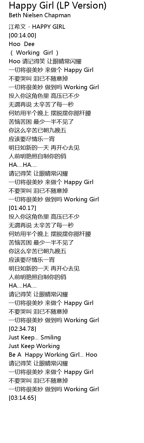 | [03:02.64] | yi qie jiang hen mei miao lai zuo ge Happy Girl |