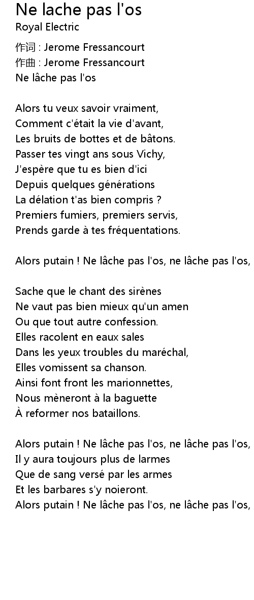 | Alors putain ! Ne l che pas l' os, ne l che pas l' os, ne l che pas l' os ! | |