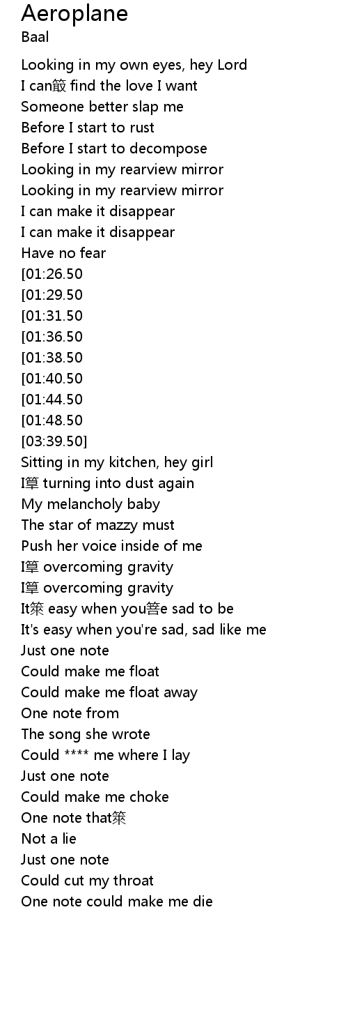 | [00:22.50][01:29.50][02:35.50][03:21.50] | Music is my aeroplane |
