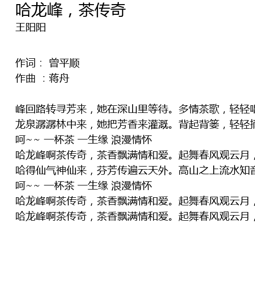 | hā lóng fēng a chá chuán qí, chá xiāng piāo mǎn qíng hé ài. qǐ wǔ chūn fēng guān yún yuè, hǎo shān hǎo shuǐ děng nǐ lái. |
