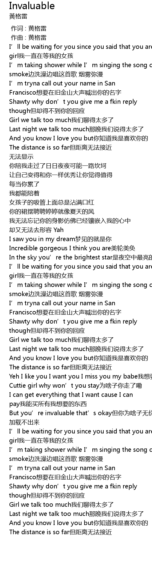 | [01:56.279] | But you’re invaluable that’s okay但你为啥子无价嘞 |