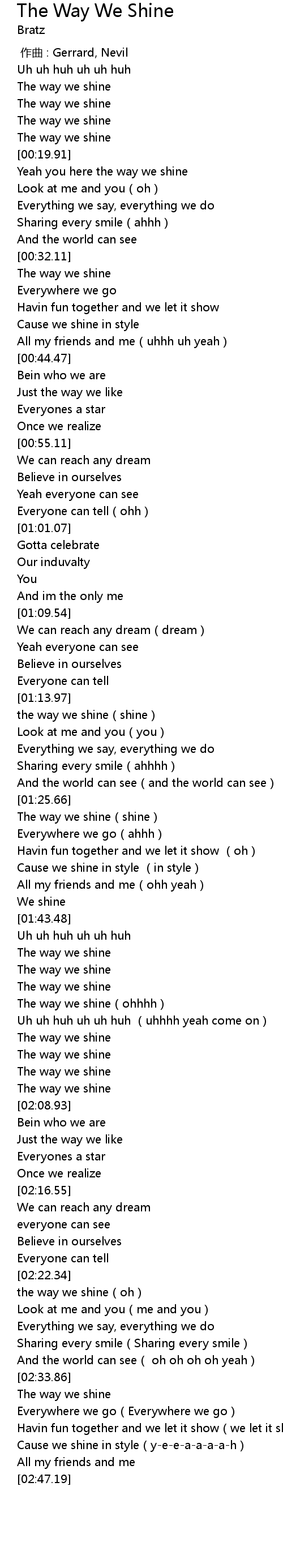 | [02:41.00] | Cause we shine in style(y-e-e-a-a-a-a-h) |