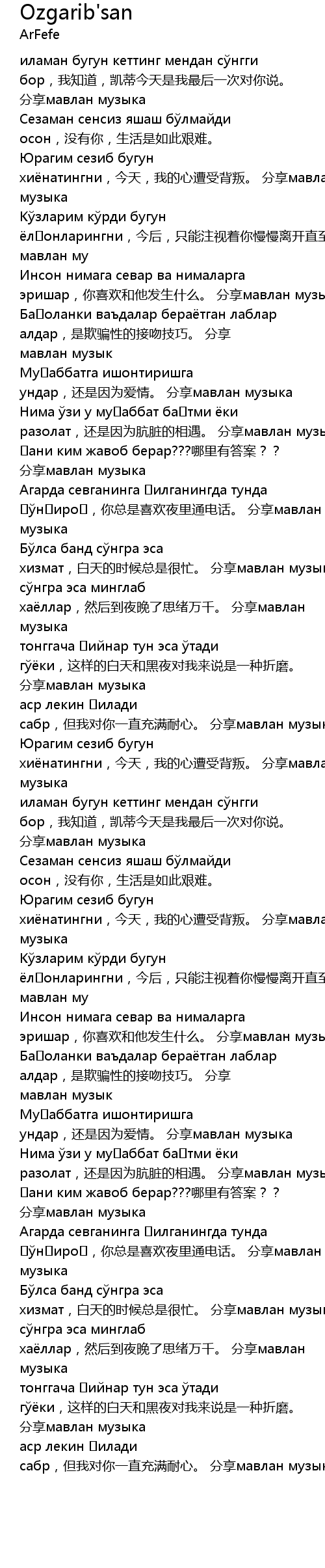 | [02:47.558] | Нима ўзи у муҳаббат баҳтми ёки разолат,还是因为肮脏的相遇。 分享мавлан музыка |