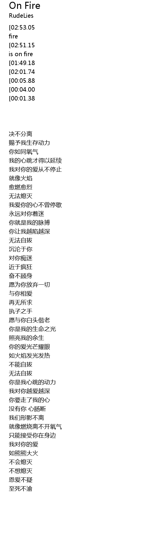 | [02:19.08][01:49.18][00:41.53][00:11.75] | This love is on fire |