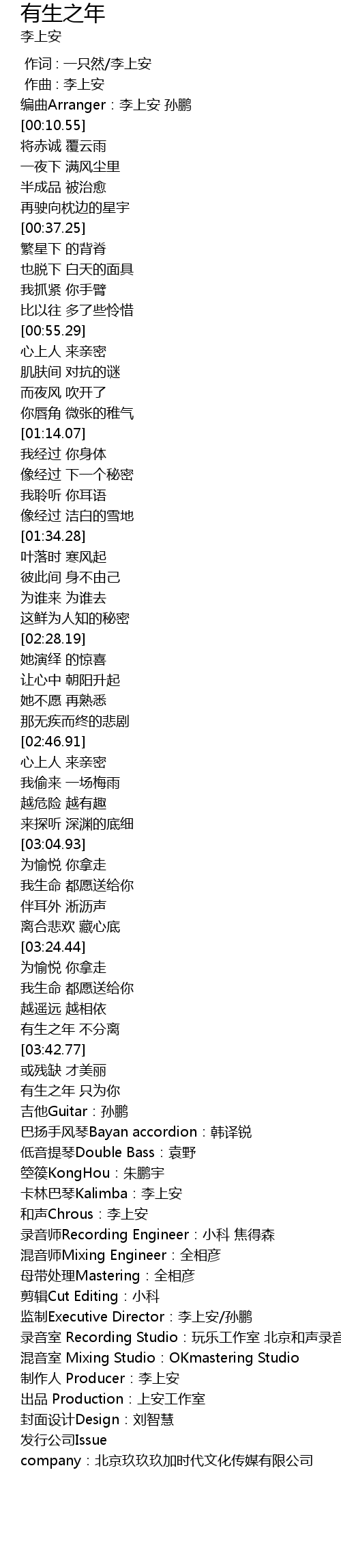 | [04:02.85] | 发行公司Issue company:北京玖玖玖加时代文化传媒有限公司 |