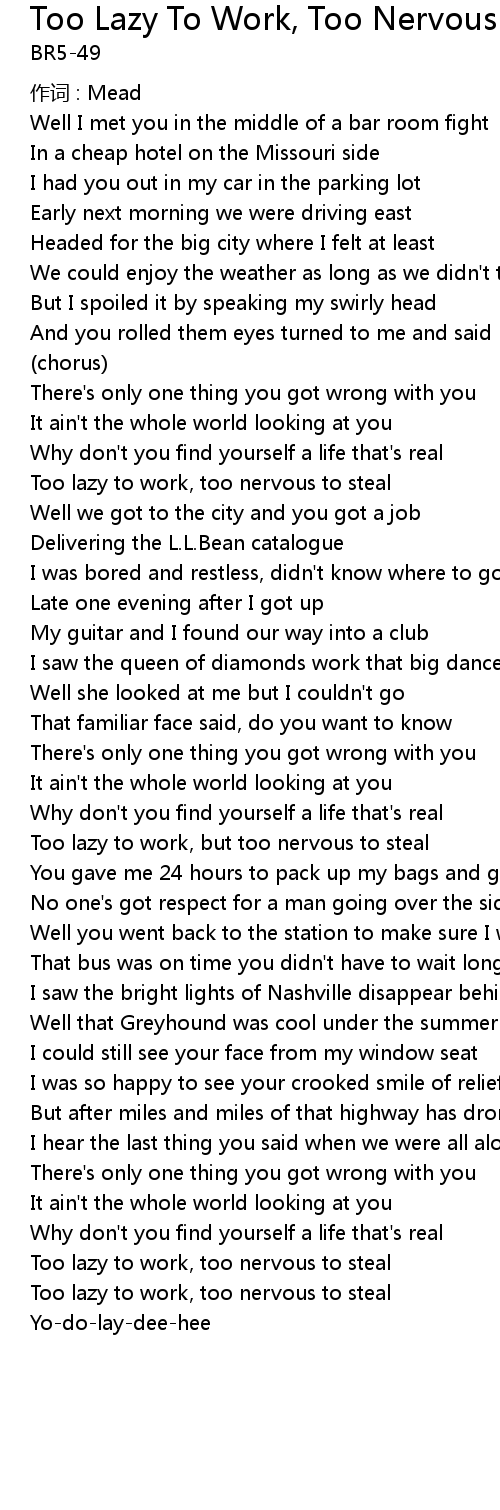 | Song | Too Lazy To Work, Too Nervous To Steal |