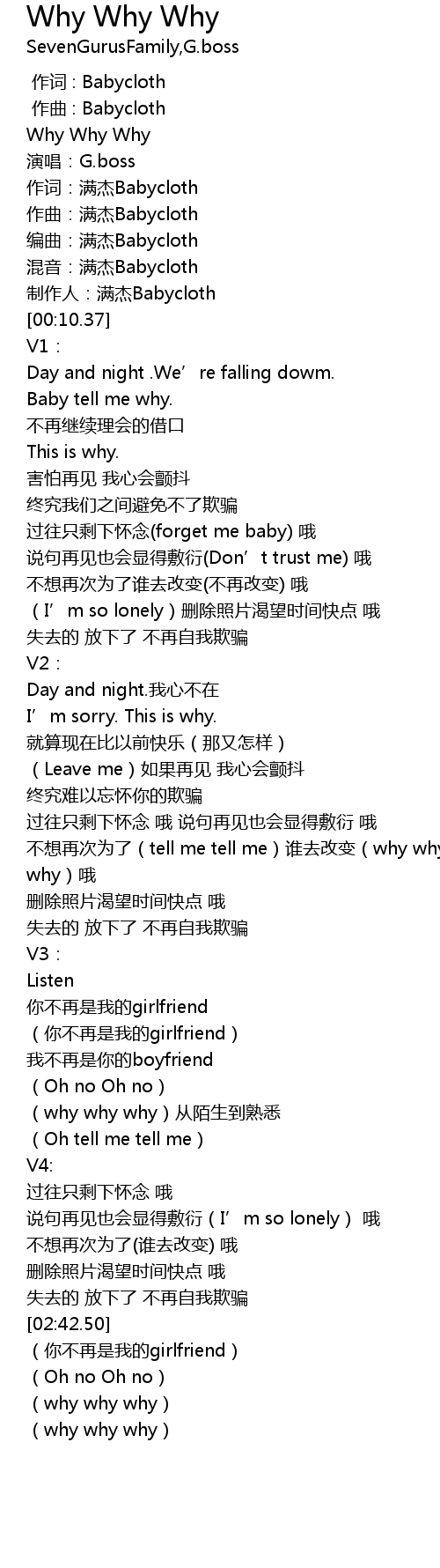 | [01:34.37] | bù xiǎng zài cì wèi le tell me tell me shuí qù gǎi biàn why why why ó |