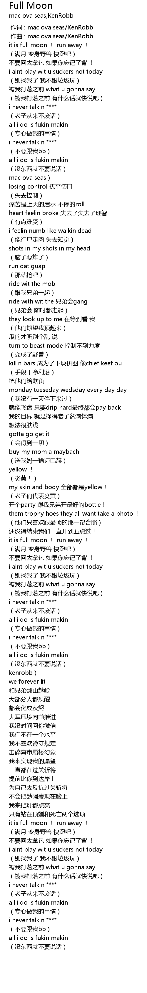 | [01:09.376] | turn to beast mode kòng zhì bú dào lì dù |