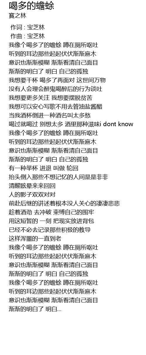 | [00:58.419] | 我像个喝多了的蟾蜍 蹲在厕所呕吐 |