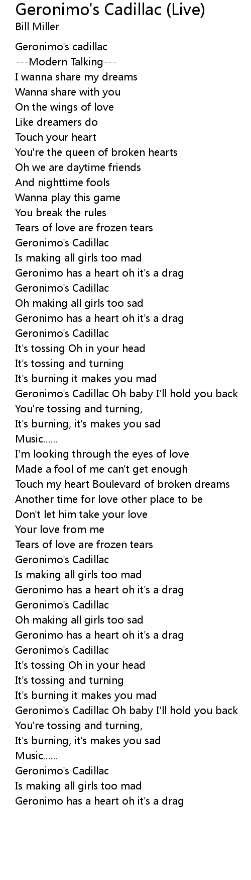 Geronimo's Cadillac Oh baby I'll hold you back |