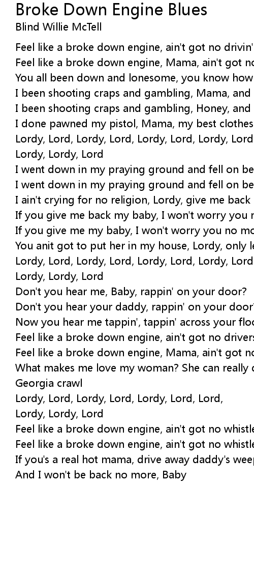 Feel like a broke down engine, Mama, ain't got no drive at all |
