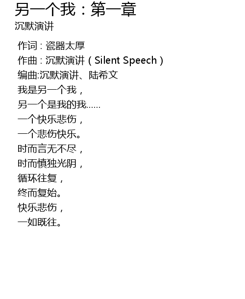 | [00:01.000] | zuò qǔ : chén mò yǎn jiǎng Silent Speech |