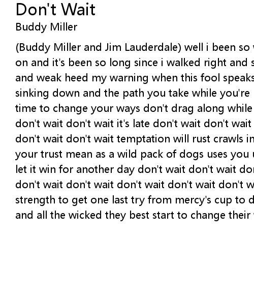 (Buddy Miller and Jim Lauderdale) well i been so wrong brought lots of suffering on and it's been so long since i walked right and strong just look at me so lost and weak heed my warning when this fool speaks well i hate to see your sun sinking down and the path you take while you're losing ground there's precious time to change your ways don't drag along while it's getting late don't wait don't wait don't wait it's late don't wait don't wait don't wait don't wait don't wait don't wait temptation will rust crawls in with the fog eats away at your trust mean as a wild pack of dogs uses you up throws your life away don't let it win for another day don't wait don't wait don't wait it's late don't wait don't wait don't wait don't wait don't wait don't wait now i'm praying for strength to get one last try from mercy's cup to drink before it's time to die and all the wicked they best start to change their ways |