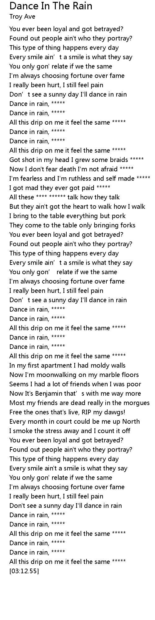 | [03:00.46] | Dance in rain, ***** |