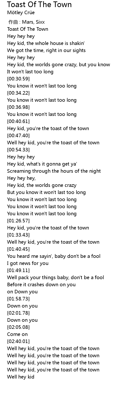 | [00:43.30] | Hey kid, you're the toast of the town |