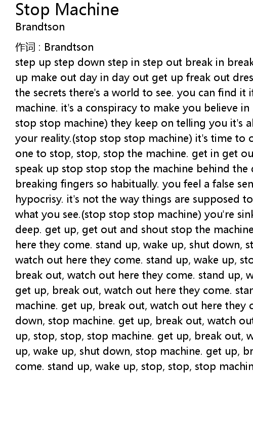 | step up step down step in step out break in break out break up break down make up make out day in day out get up freak out dress up get down get down. behind the secrets there' s a world to see. you can find it if you only stop, stop, stop machine. it' s a conspiracy to make you believe in everything you can see. stop stop stop machine they keep on telling you it' s all for free though it isn' t your reality. stop stop stop machine it' s time to open up your eyes and be the one to stop, stop, stop the machine. get in get out get up get down break up speak up stop stop stop the machine behind the door the hide from you and me, breaking fingers so habitually. you feel a false sense of security, a blanket of hypocrisy. it' s not the way things are supposed to be, and what you get is not what you see. stop stop stop machine you' re sinking further, you' re in way too deep. get up, get out and shout stop the machine. get up, break out, watch out here they come. stand up, wake up, shut down, stop machine. get up, break out, watch out here they come. stand up, wake up, stop, stop, stop machine. get up, break out, watch out here they come. stand up, wake up, shut down, stop machine. get up, break out, watch out here they come. stand up, wake up, stop, stop, stop machine. get up, break out, watch out here they come. stand up, wake up, shut down, stop machine. get up, break out, watch out here they come. stand up, wake up, stop, stop, stop machine. get up, break out, watch out here they come. stand up, wake up, shut down, stop machine. get up, break out, watch out here they come. stand up, wake up, stop, stop, stop machine. |