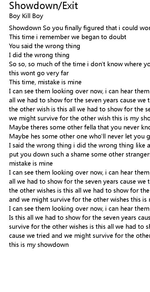 I can see them looking over now, i can hear them talking once too much is this all we had to show for the seven years cause we tried and we might survive for the other wish is this all we had to show for the seven years cause we tried and we might survive for the other wish this is my showdown |