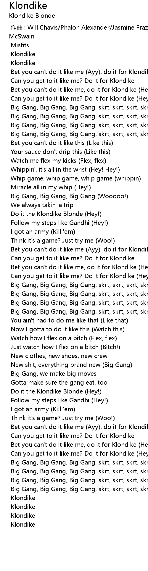 | [00:15.694] | Bet you can't do it like me (Ayy), do it for Klondike (Hey!) |
