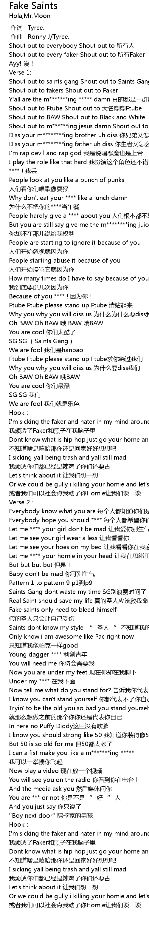 | [00:51.493] | I' m sicking the faker and hater in my mind around wǒ fán tòu le Faker hé hēi zǐ zài wǒ nǎo zi lǐ |