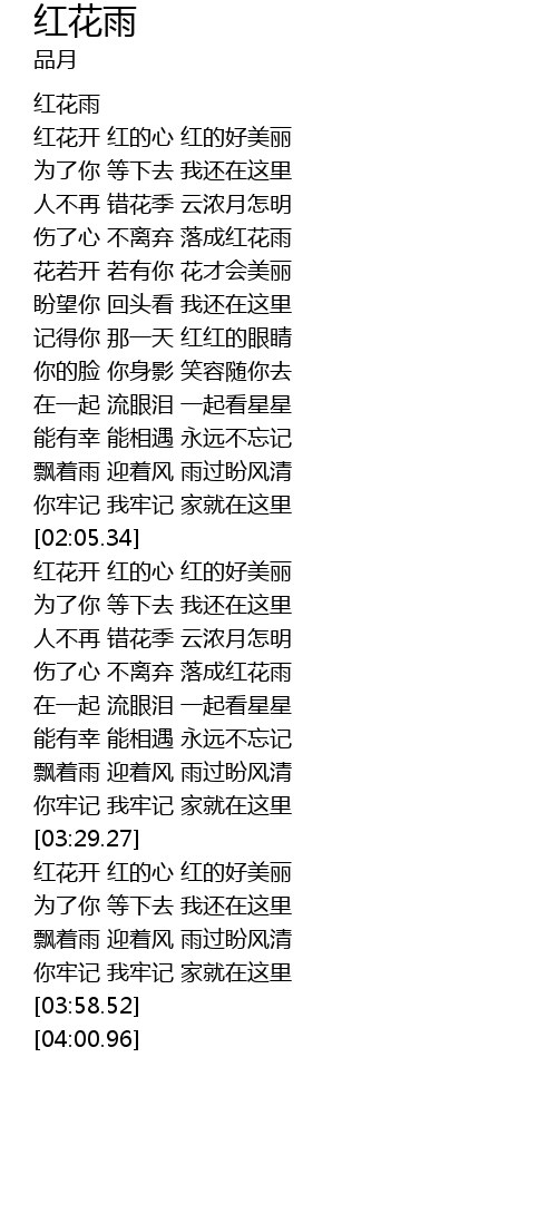 | [03:30.46] | 红花开 红的心 红的好美丽 |