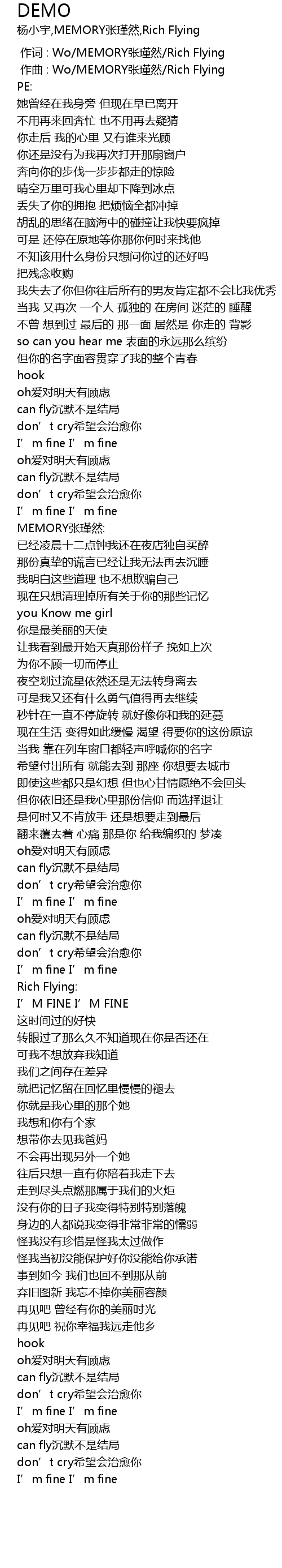 | [00:01.000] | zuo qu : Wo MEMORY zhang jin ran Rich Flying |