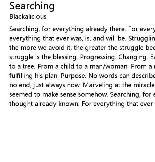 Searching, for everything already there. For every thought already known. For everything that ever was, is, and will be. Struggling. Oh how we struggle. And the more we avoid it, the greater the struggle becomes, until we realize, the struggle is the blessing. Progressing. Changing. Evolving. Growing. From a seed to a tree. From a child to a man/woman. From a man/woman to a spirit to a god fulfilling his plan. Purpose. No words can describe the unnamable. No beginning, no end, just always now. Marveling at the miracle and all of a sudden it all seemed to make sense somehow. Searching, for everything already there. For every thought already known. For everything that ever was, is and will be. |