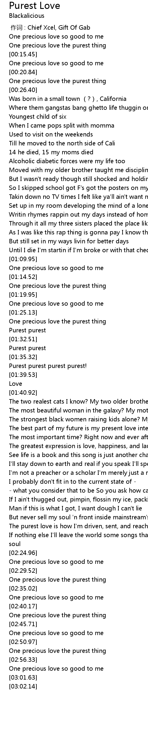 | [02:19.35] | The purest love is how I' m driven, sent, and reach for my goals |
