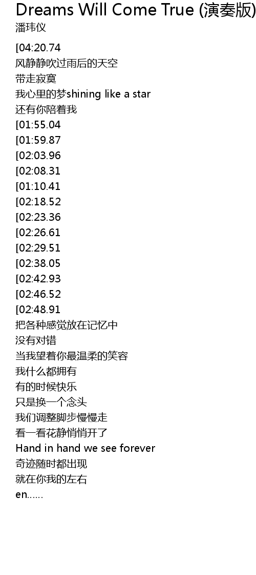 | [00:09.00][04:20.74] | pān wěi yí Dreams Will Come True |