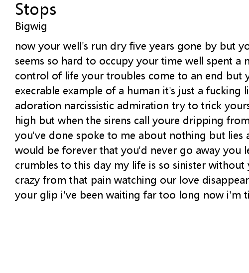 now your well's run dry five years gone by but you still sit and wonder why it seems so hard to occupy your time well spent a needle your best friend no control of life your troubles come to an end but you start them up again execrable example of a human it's just a fucking lie-white trash malevolent adoration narcissistic admiration try to trick yourself and say you won't get high but when the sirens call youre dripping from my eyes when i think of what you've done spoke to me about nothing but lies and now you are gone said it would be forever that you'd never go away you left my heart to whither as it crumbles to this day my life is so sinister without you being here and i'll go crazy from that pain watching our love disappear holding out my hand waiting for your glip i've been waiting far too long now i'm tired of your shit. |